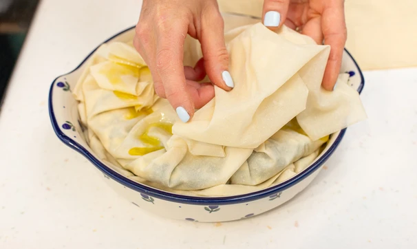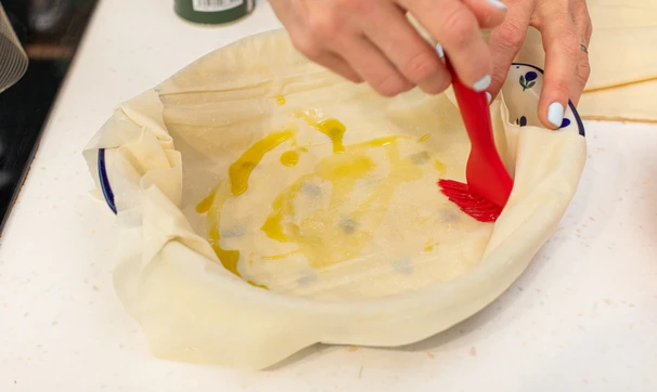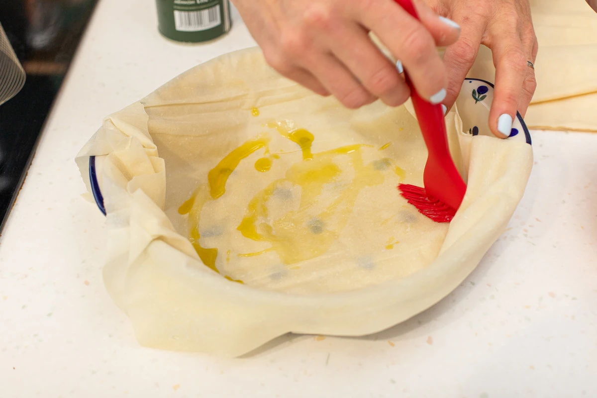 В мисочку налейте оливковое масло, подготовьте кулинарную кисть. Дно формы для запекания смажьте оливковым маслом, выложите первый слой фило, намажьте маслом.