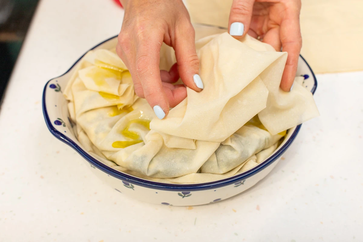 Добавьте остальные листы фило, каждый раз смазывая маслом и выкладывая начинку, пока форма не заполнится. Верх пирога накройте фило, смажьте маслом и посыпьте кунжутом.