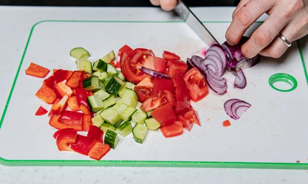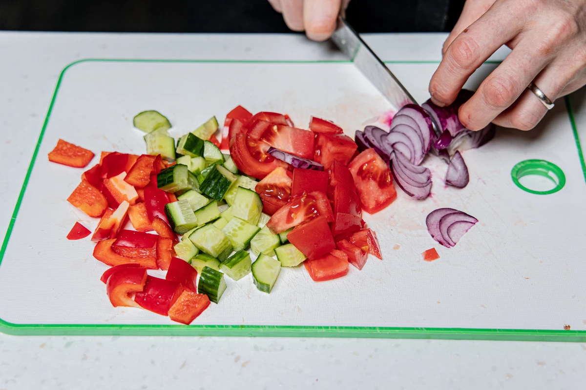 Нарежьте томаты, сладкий перец и огурцы кубиками примерно одинакового размера. Половинку сладкой красной луковицы нарежьте тонкими перьями.