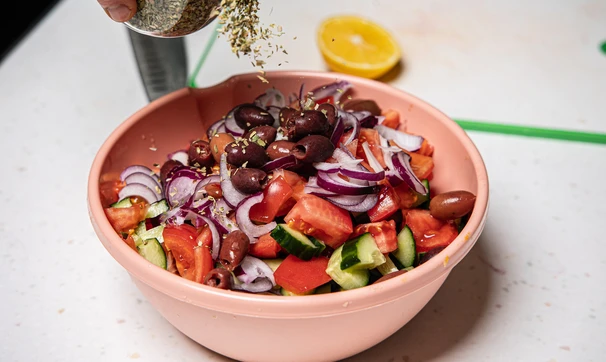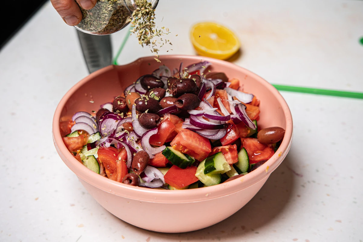 Выложите салат в глубокую миску, добавьте оливки (без жидкости) и насыпьте орегано. Посолите салат.