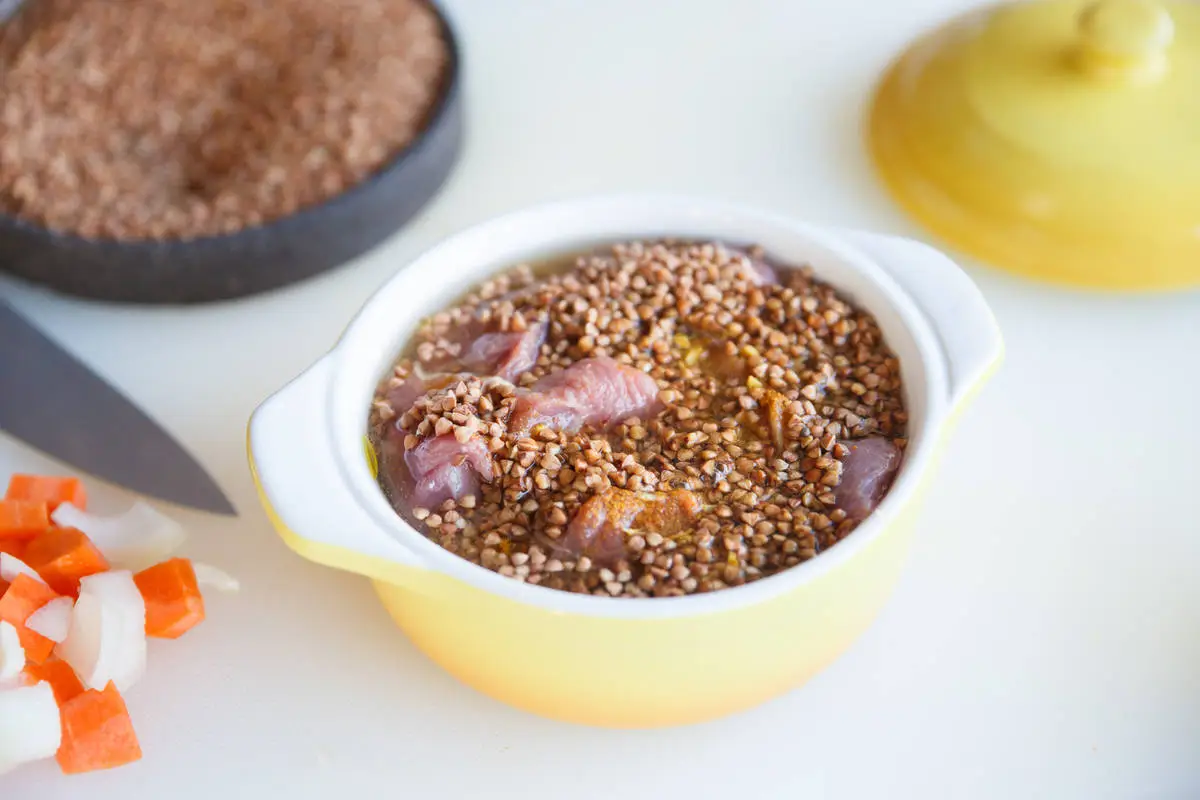 На дно горшочка или формы для запекания налейте немного масла, выложите овощи, сверху – индейку и курагу. Затем всыпьте промытую гречку, посолите и добавьте приправу. Залейте водой так, чтобы она покрывала гречку. Готовьте под крышкой (или фольгой) в духовке при 180°С около часа. Готовую гречку посыпьте рубленой петрушкой.