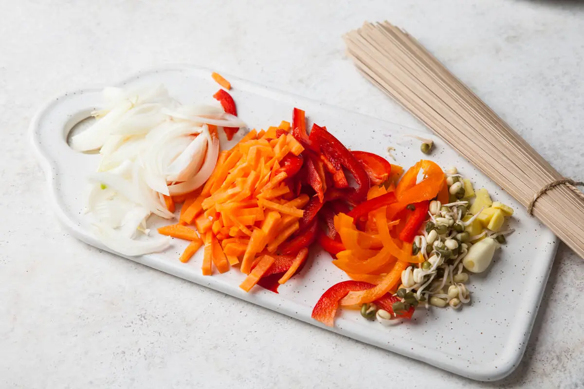 Перец, лук, морковь нарежьте тонкой соломкой. Чеснок и имбирь измельчите. Тофу порежьте кубиком.