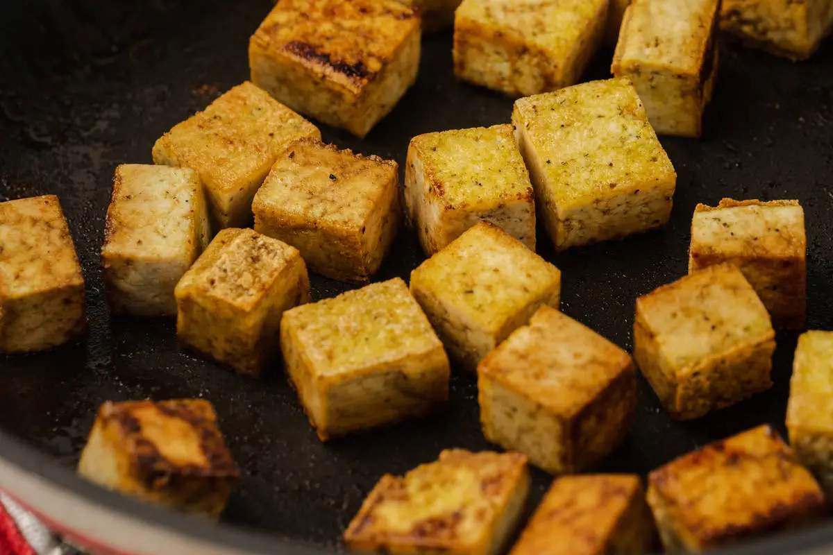 Нарежьте тофу кубиками среднего размера. Разогрейте 0,5 ст. ложки подсолнечного масла на сковороде, быстро обжарьте тофу до румяной корочки на среднем огне (на это уйдёт пара минут). Снимите с огня, тут же добавьте в горячую сковороду половину соевого соуса и быстро перемешайте. Он сразу начнёт выпариваться и слегка карамелизует кусочки тофу. Переложите тофу со сковороды.