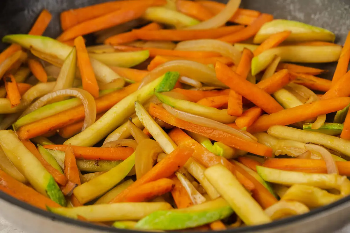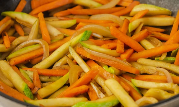 Нарежьте лук, морковь и кабачок соломкой. В ту же сковороду добавьте оставшееся масло, обжарьте морковь и лук на средне- сильном огне почти до готовности, но не до совсем мягкого состояния, пусть лук и морковь ещё немного хрустят (это займет примерно 6-8 минут). Постоянно помешивайте. Добавьте кабачки и обжаривайте ещё 2-3 минуты. Переложите со сковороды.