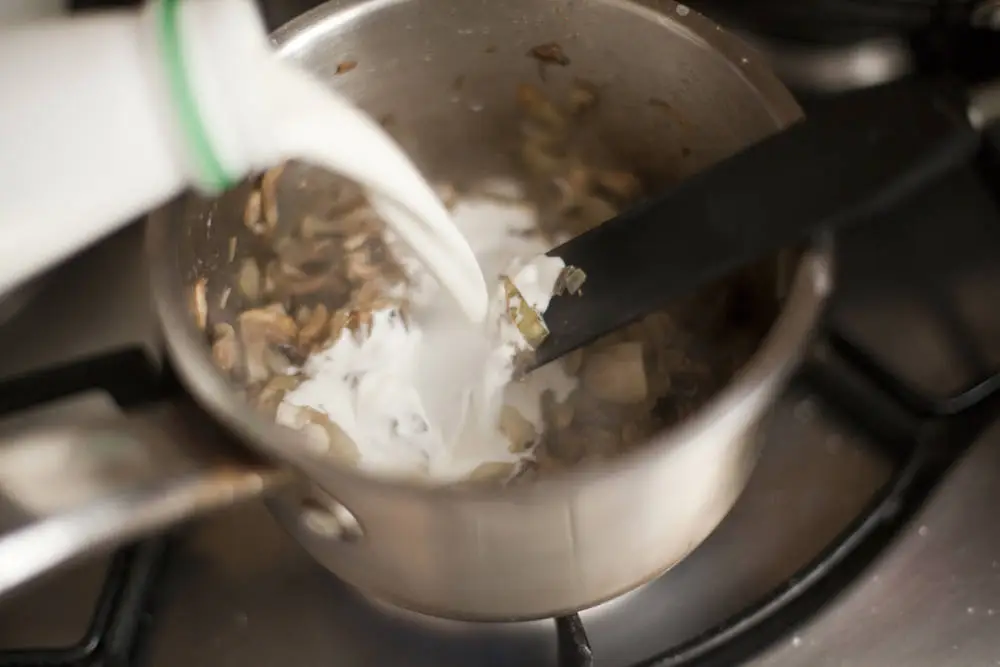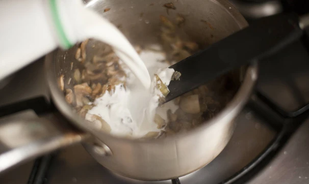 Обжарьте грибы с луком в течение минуты и влейте тонкой струйкой холодные сливки, постоянно мешая. Доведите соус до кипения, убавьте огонь и периодически помешивайте, соус готов, когда загустеет.