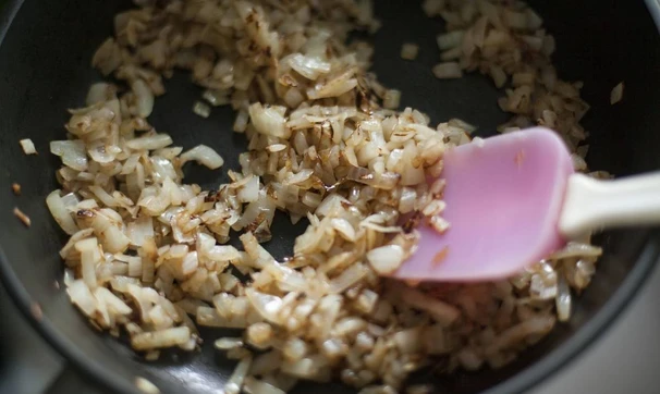 Лук мелко нарежьте и обжарьте до золотистости, выложите на тарелку.