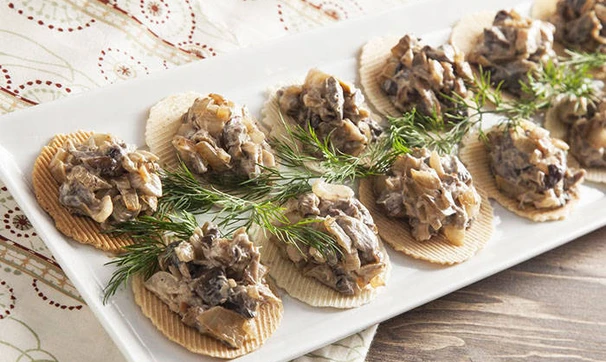 Вкусную грибную икру можно приготовить из свежих грибов, а можно, как тут — из замороженных. Отличная идея — подавать икру на хлебцах — хорошо смотрится и не перегружает блюдо лишними калориями, как хлеб.