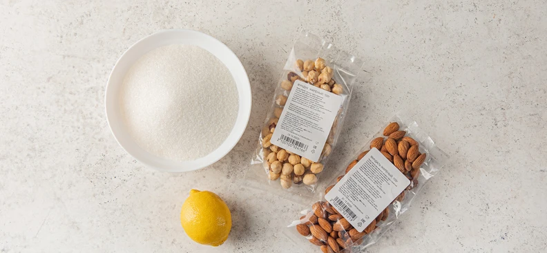 В рецепте используются товары из категорий: Орехи, чипсы и снеки; Масла, соусы, специи, сахар и соль; Овощи, фрукты, ягоды, зелень