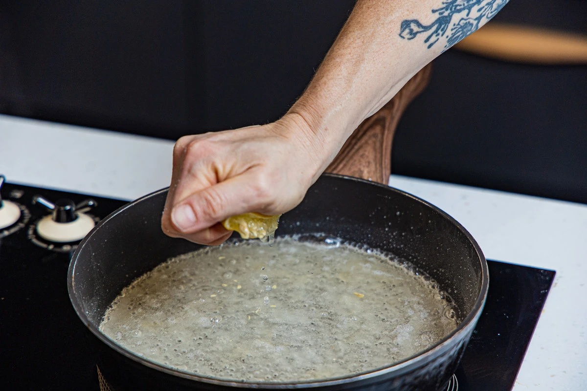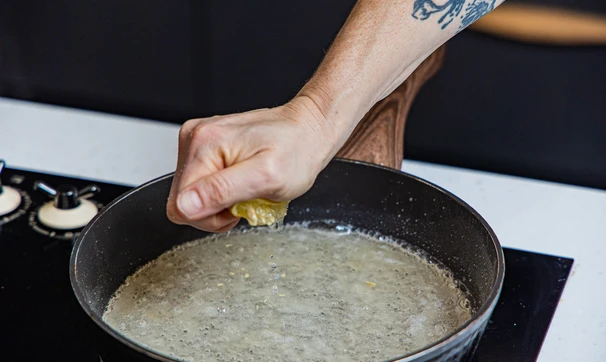 Добавьте сок лимона. Доведите смесь до кипения и варите на среднем огне. Как только смесь начнёт коричневеть, делайте пробу на карамель. Ложкой возьмите немного карамели и капните на холодную тарелку или кусочек льда: если карамель готова, то капля, застывая, становится ломкой и твёрдой. Во время проведения пробы убирайте сковороду с огня, карамель можно сжечь очень быстро.