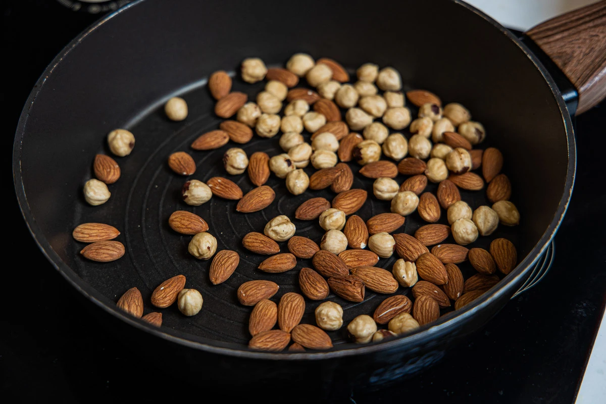 Параллельно с приготовлением карамели порубите орехи и подогрейте их на сковороде или в духовке, так они лучше перемешаются с карамелью.