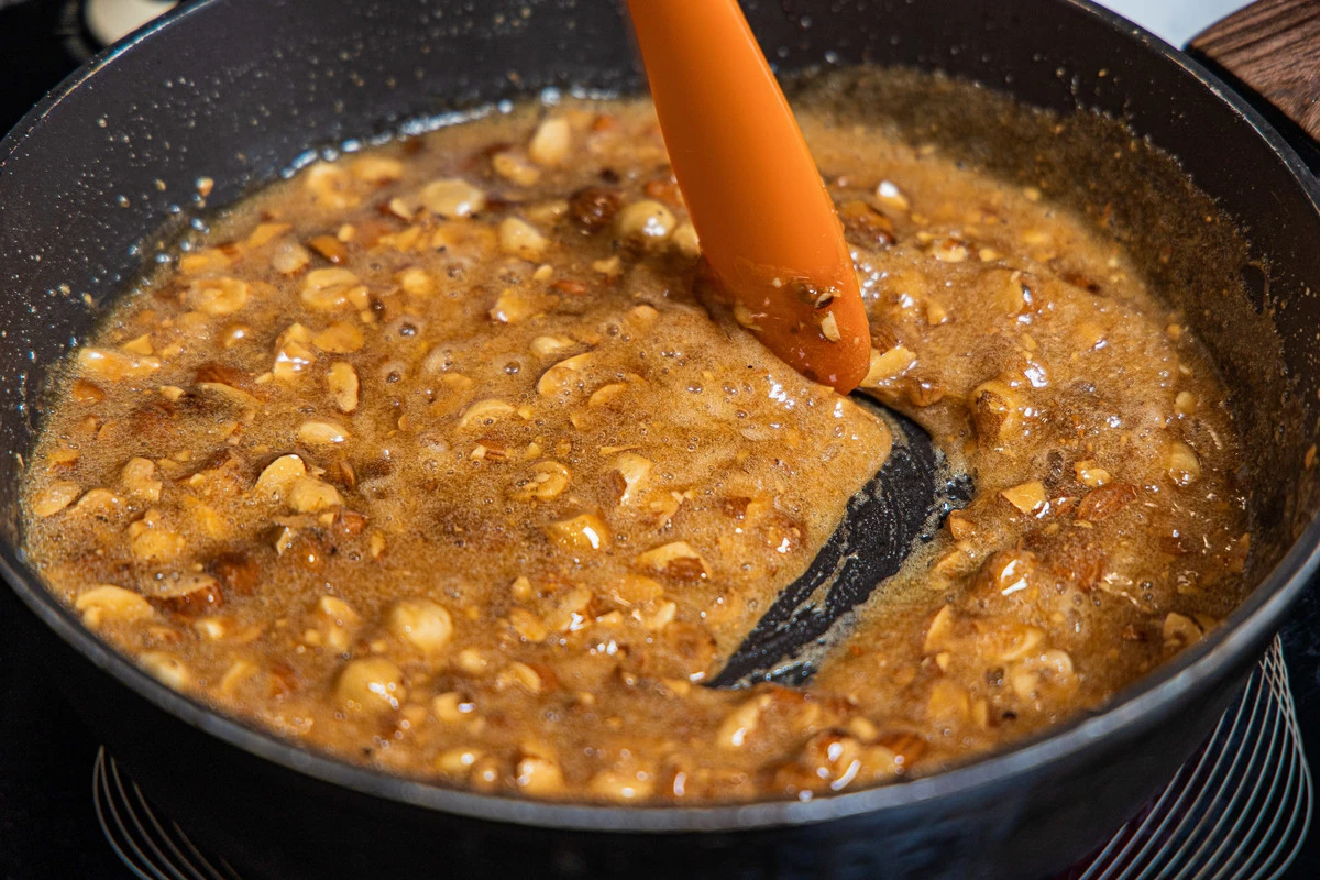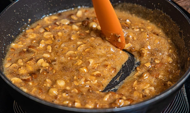 В готовую кипящую карамель всыпьте орехи.