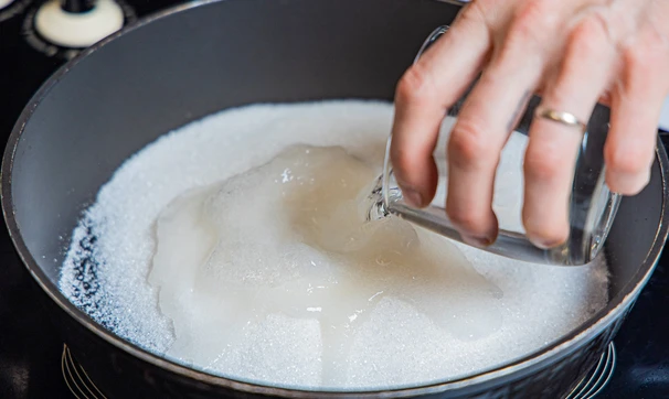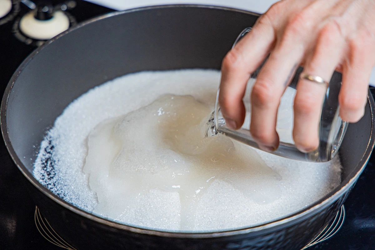 В сковороду с толстым дном или сотейник насыпьте сахар, добавьте воду.