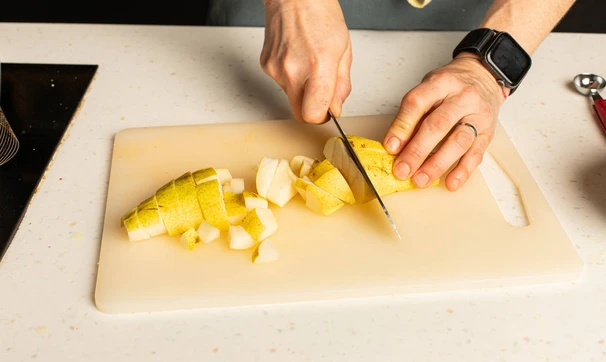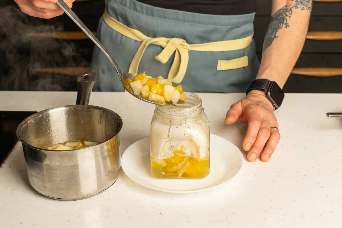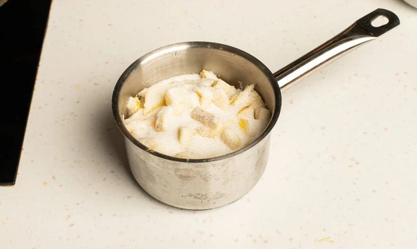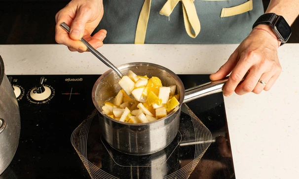 Сложите фрукты в кастрюлю, добавьте кардамон, засыпьте сахаром, перемешайте и оставьте на час, чтобы выделился сок.