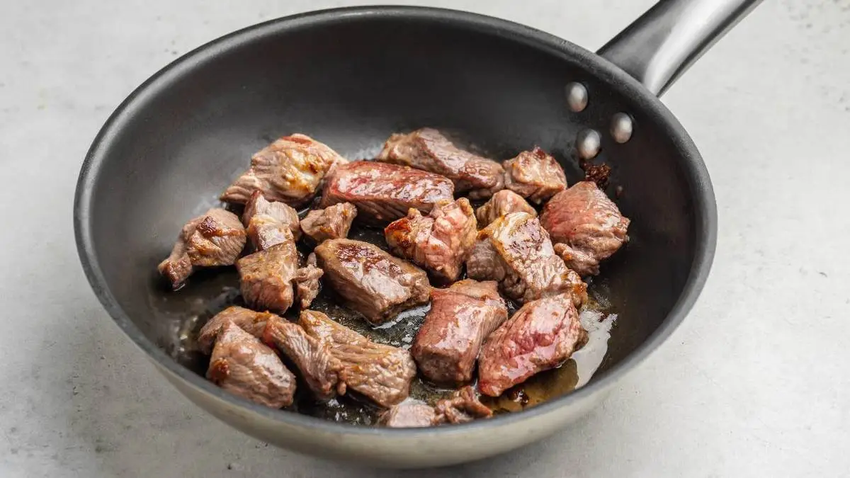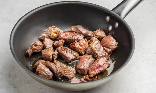 Обжарьте на растительном масле говядину до появления корочки и выпаривания всего мясного сока. Добавьте лук и жарьте до золотистой корочки.