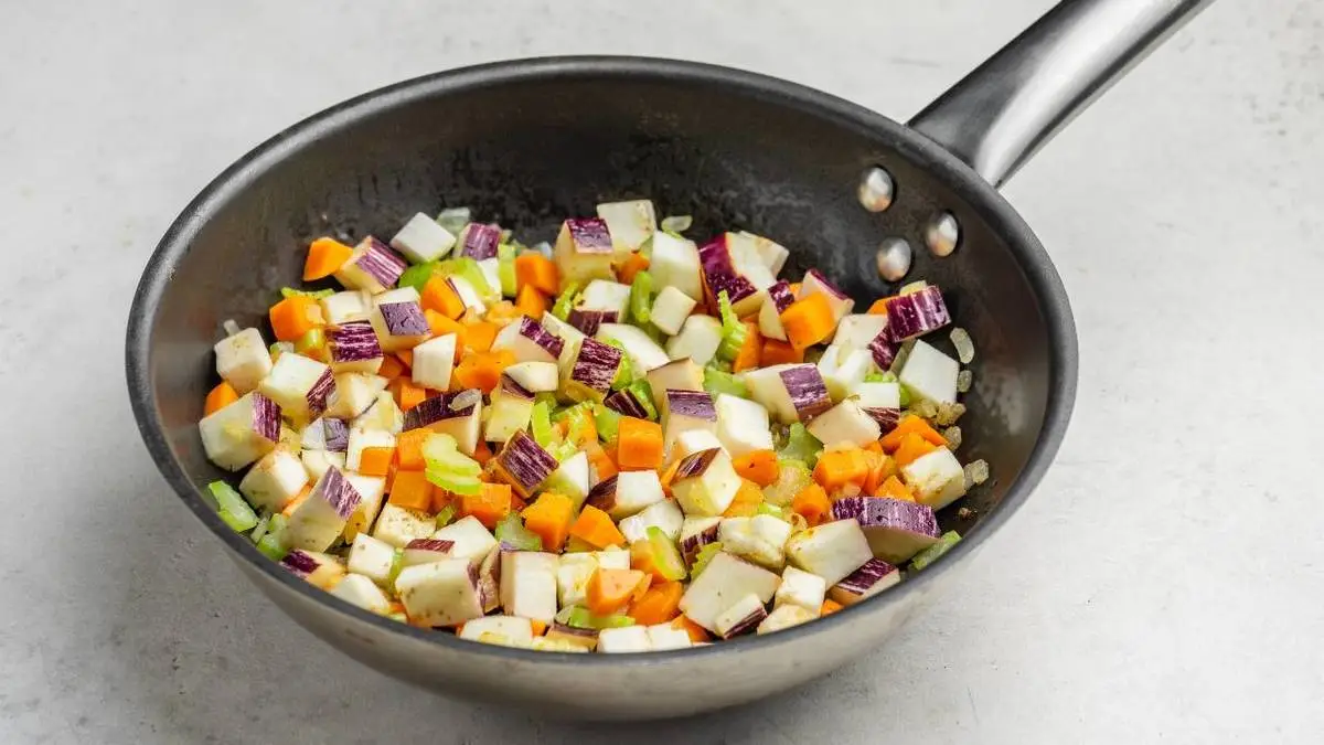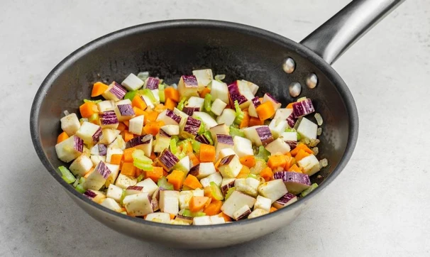 Затем — стебель сельдерея и жарьте ещё 3 минуты, помешивая.