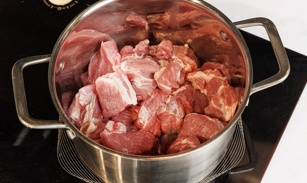 В большую кастрюлю налейте масло, разогрейте, выложите мясо. Через несколько минут посолите по вкусу и готовьте в общей сложности 10–15 минут до образования золотистой корочки. Периодически помешивайте.