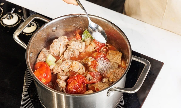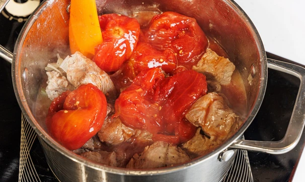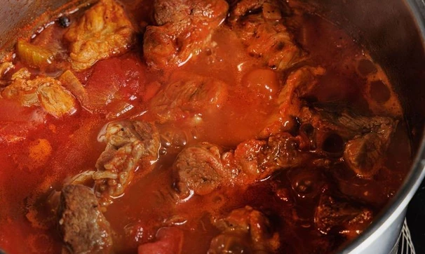 Тушите на медленном огне 40–45 минут. Если вдруг жидкость выкипит или вы любите более жидкий соус, добавьте немного воды.