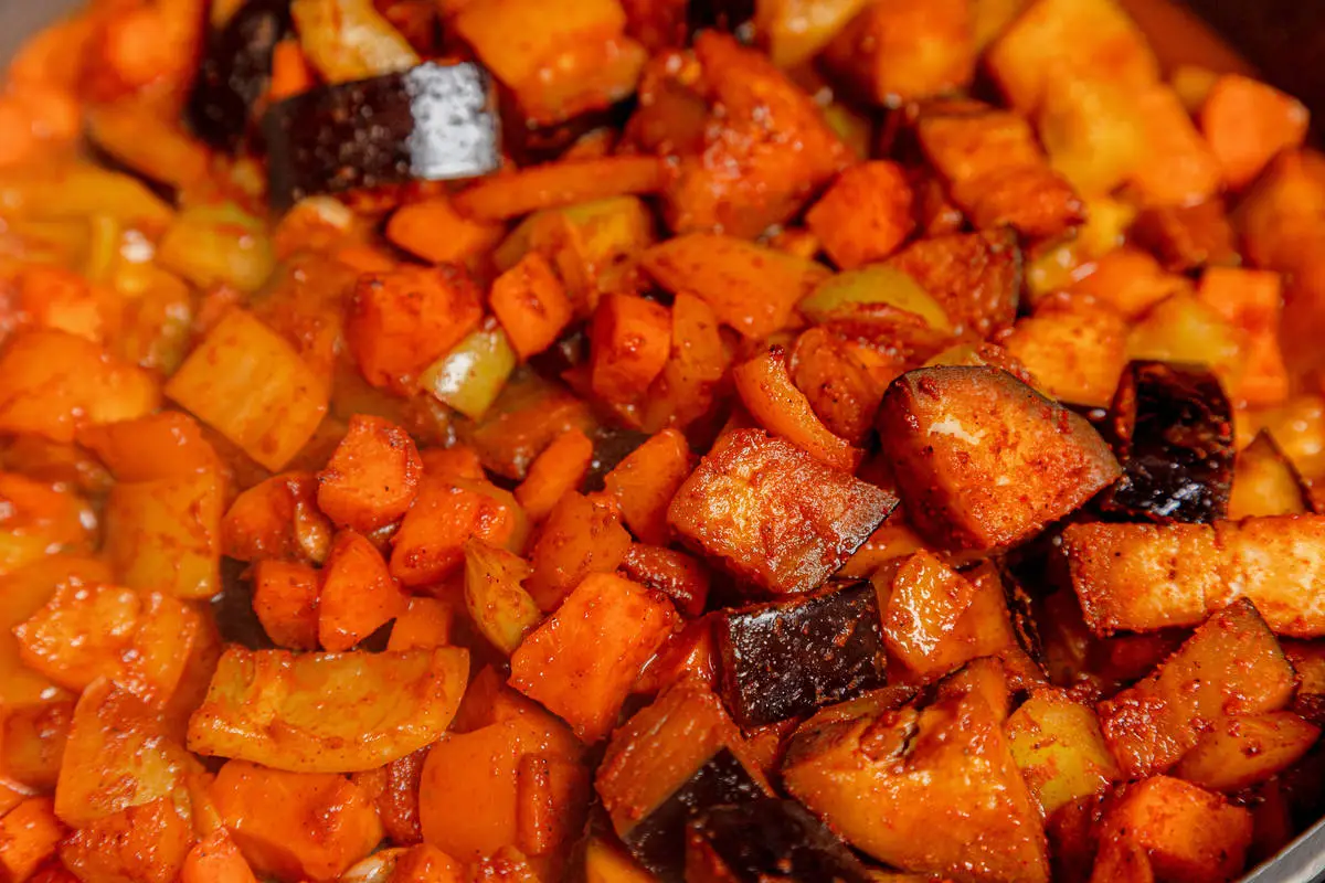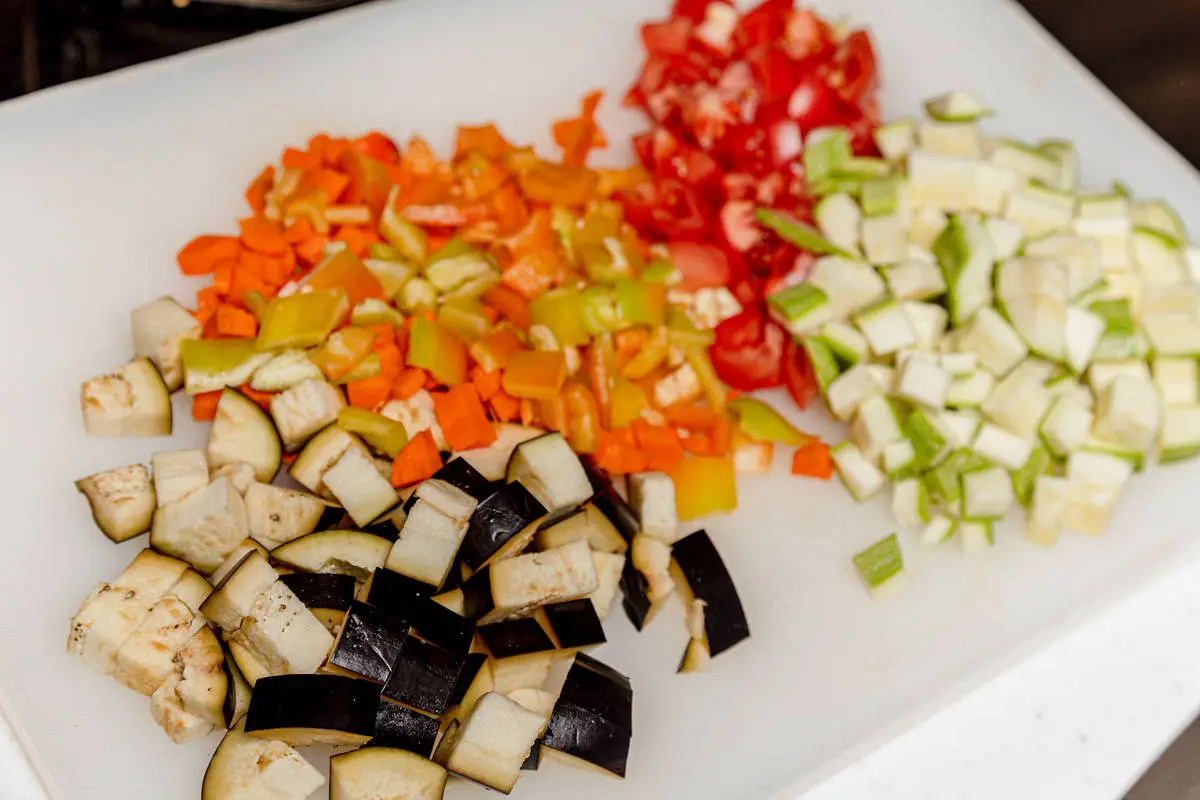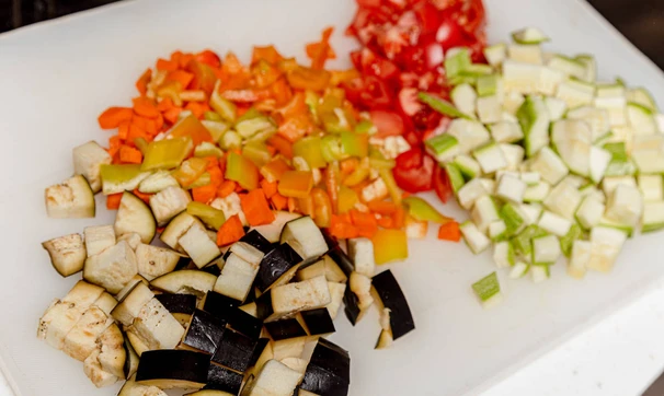 Баклажан, перец и кабачок нарежьте средними кубиками. Морковь очистите и нарежьте мелкими кубиками. У чеснока удалите сердцевинку, измельчите. Томаты нарежьте крупными кубиками.