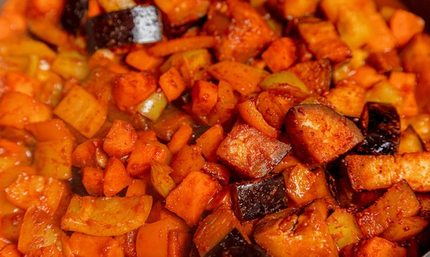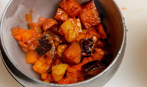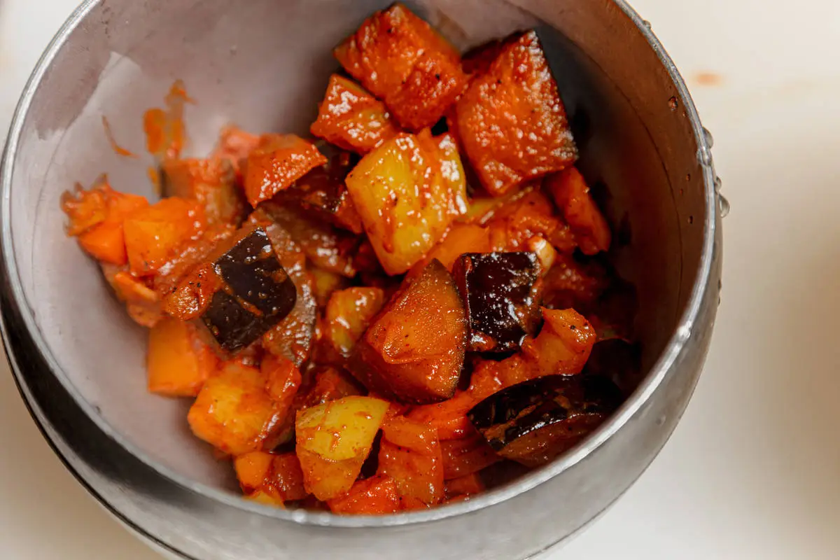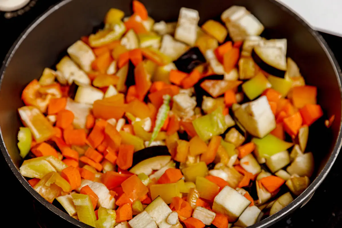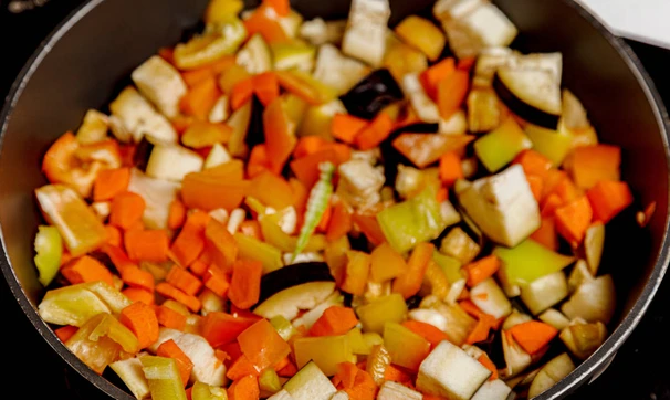 На сковороде на растительном масле на среднем огне обжарьте баклажаны, морковь и перец с чесноком.