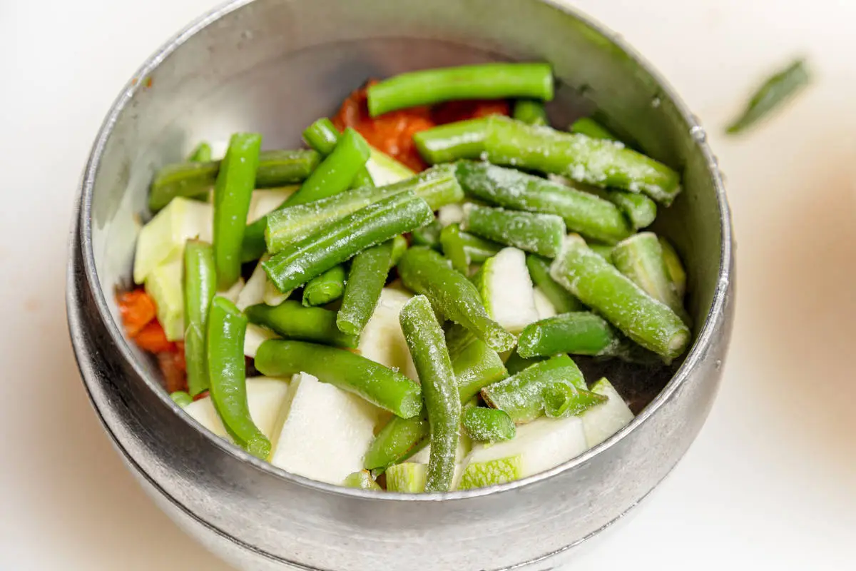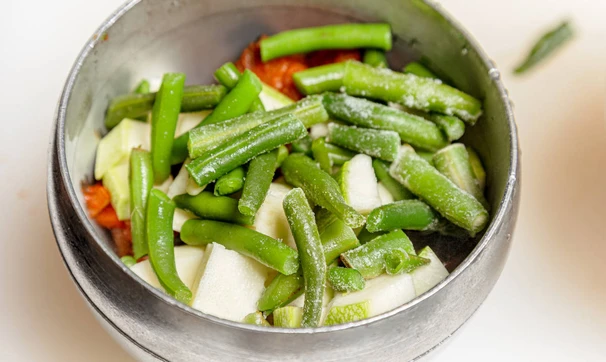 Затем слоями: кабачки, свежая или замороженная фасоль, а потом помидоры.
