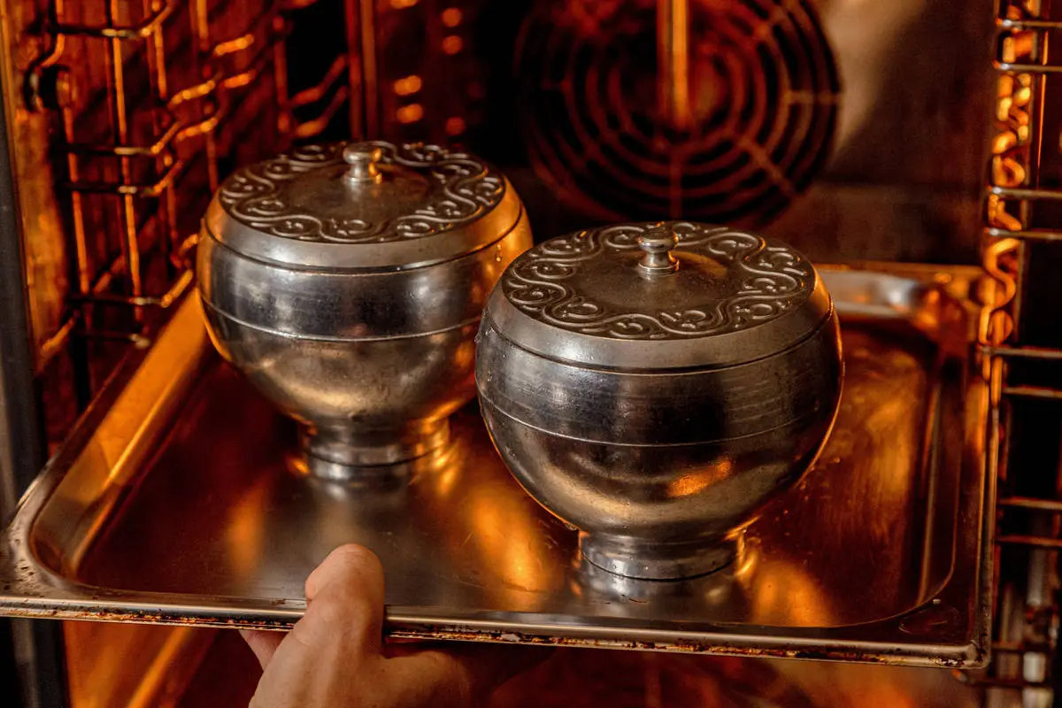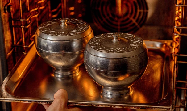 Добавьте душистый горошек и лавровый лист, посолите. В каждый горшочек долейте немного воды (примерно по 50 мл). Накройте горшочки крышками и поставьте в холодную духовку, разогрейте до 180 °C и запекайте гювеч около 40 минут.