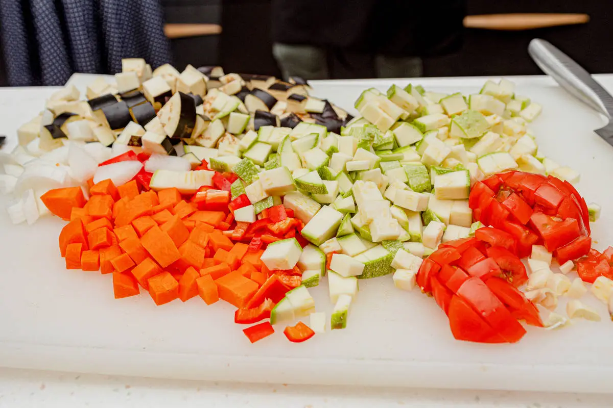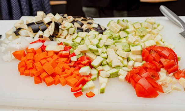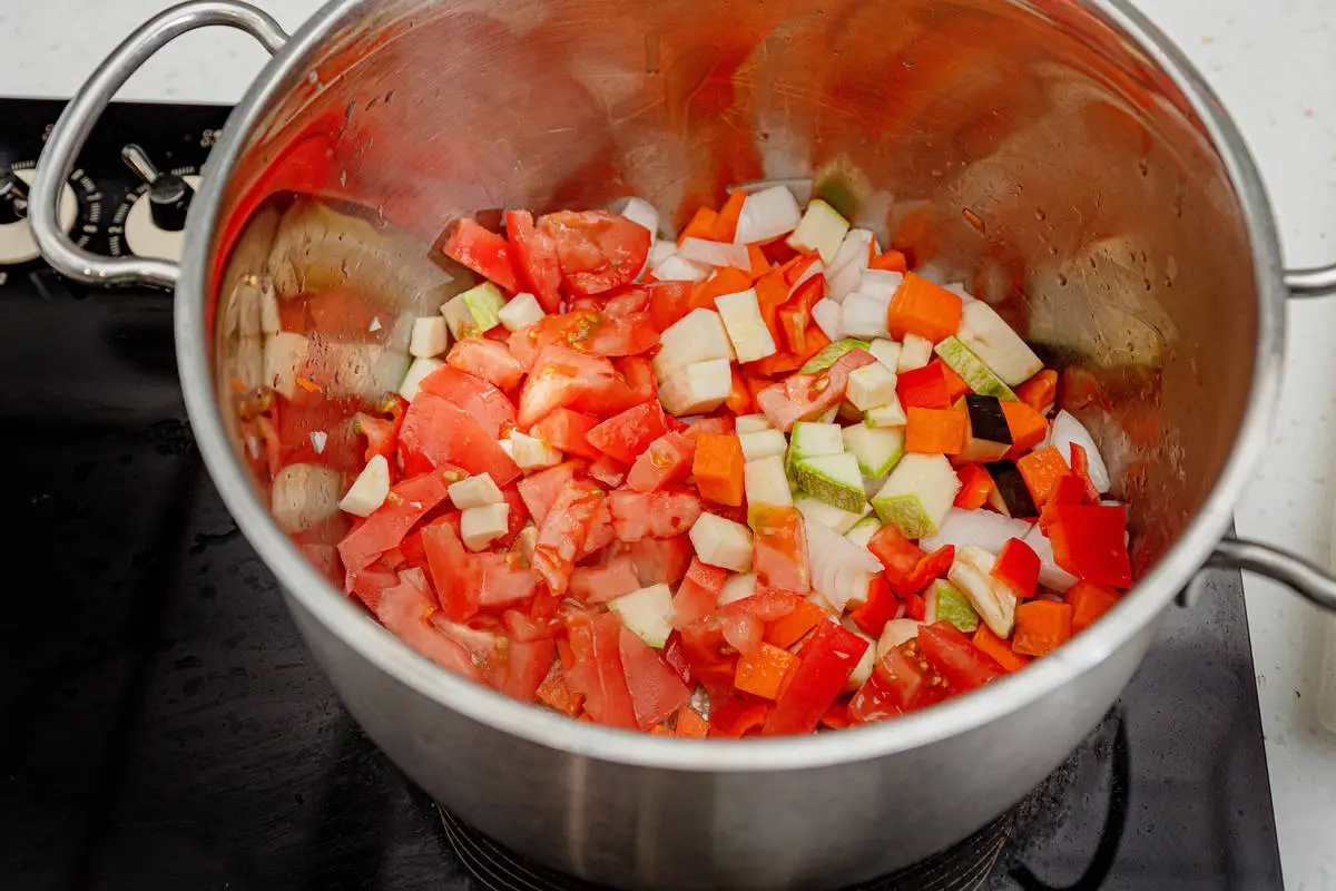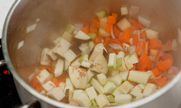 Лук, морковь и чеснок почистите. Чеснок мелко нарежьте, предварительно удалив сердцевинку. Остальные овощи нарежьте мелкими кубиками.