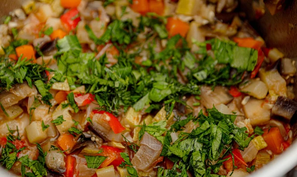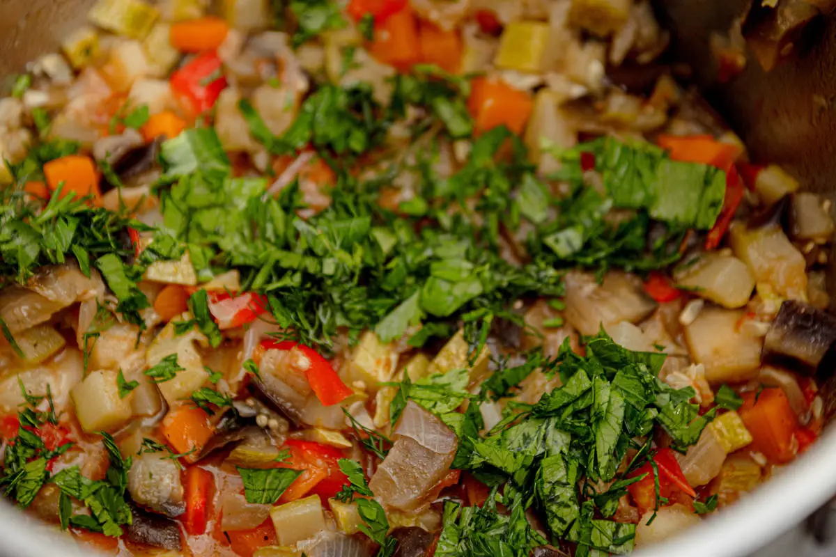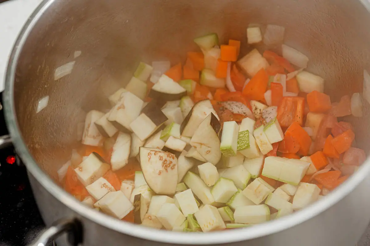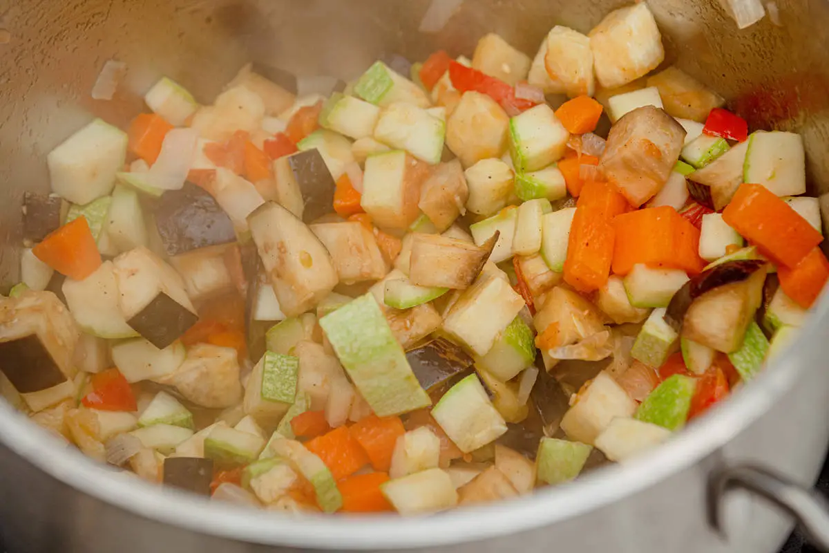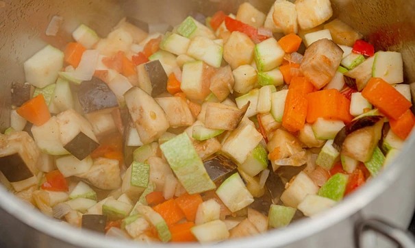 Добавьте кабачки и баклажаны, перемешайте и жарьте ещё минут 10 на среднем огне, периодически помешивая.