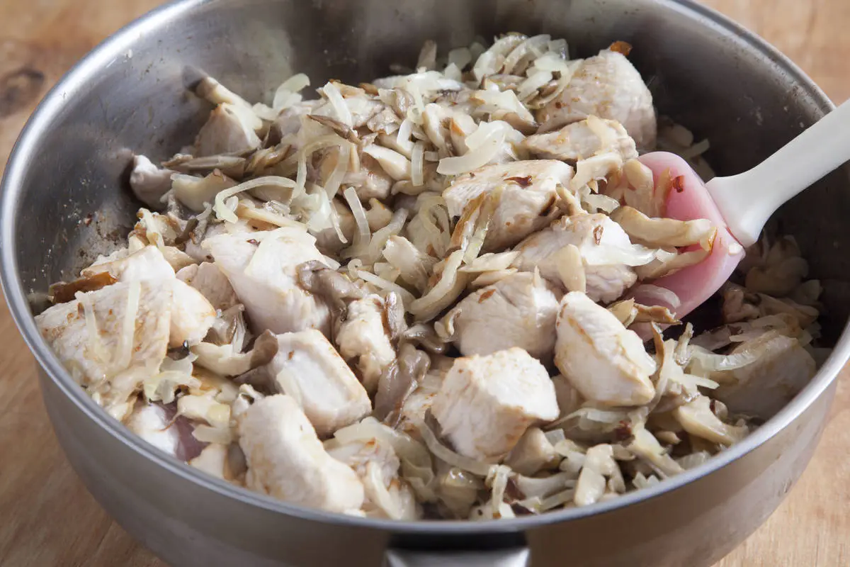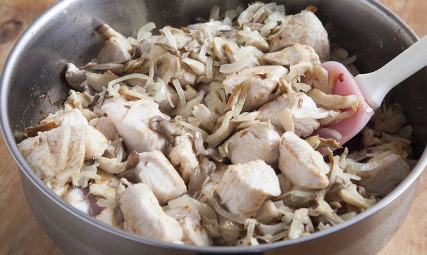 Вешенки нарежьте соломкой, лук полукольцами, индейку небольшими кубиками.