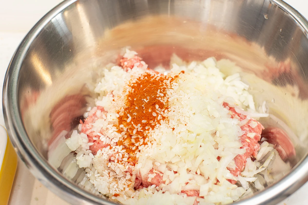 В миску выложите фарш, добавьте лук, чеснок, рис, посолите, поперчите по вкусу.
