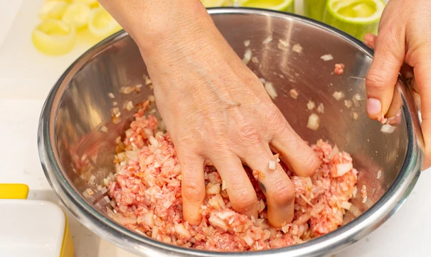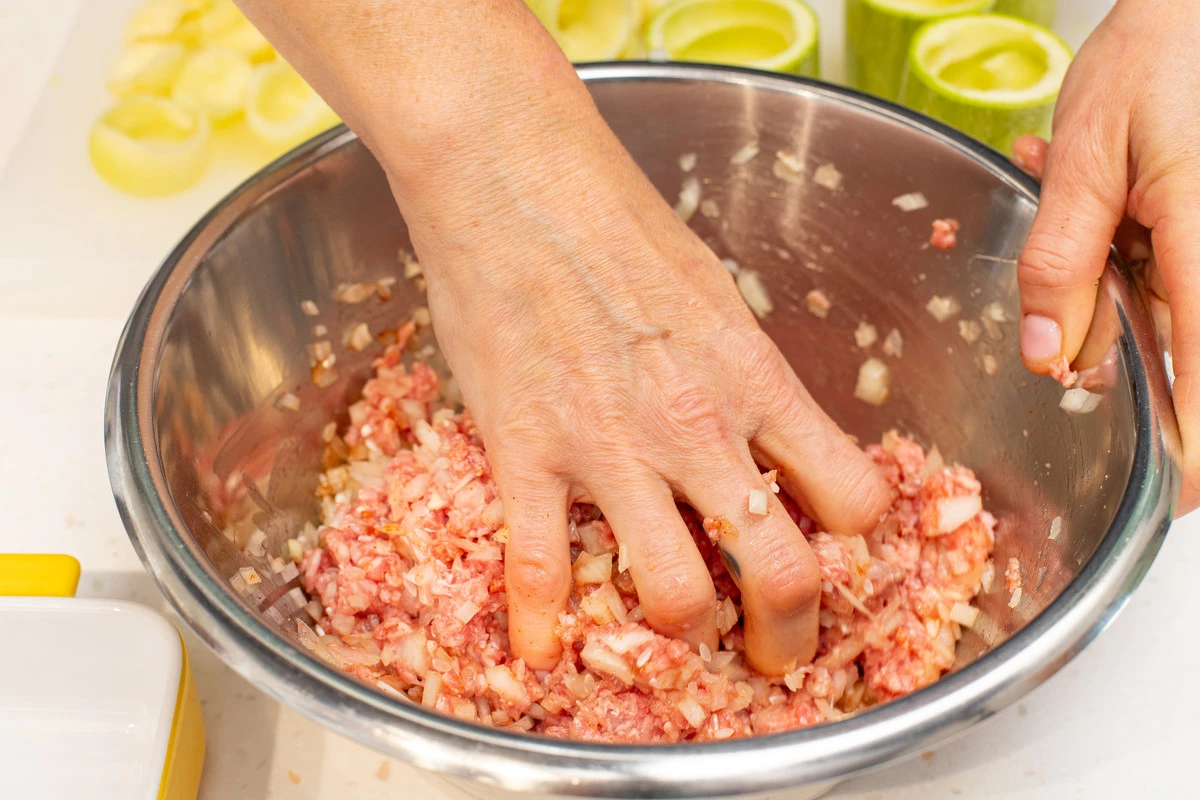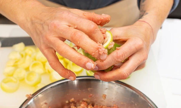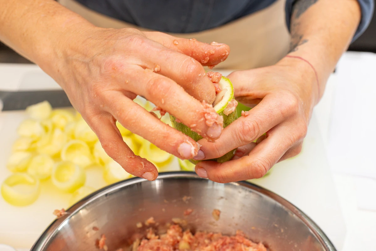 В каждую «башенку» кабачка выложите фарш, слегка утрамбуйте.