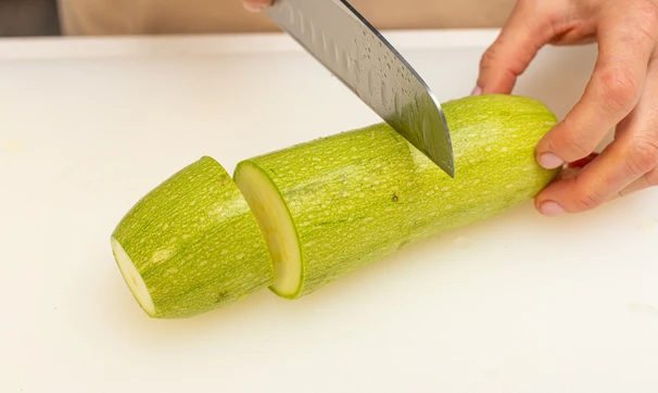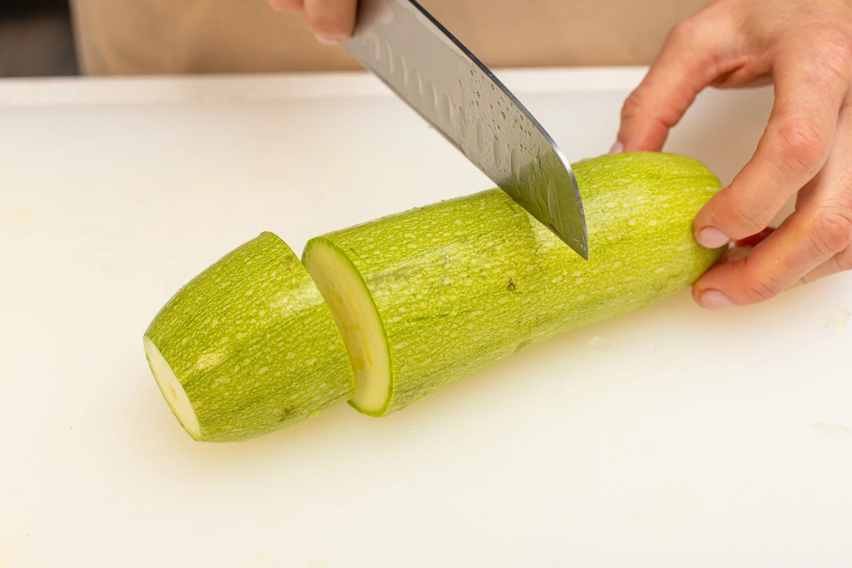 Кабачки помойте, отрежьте плодоножки. Разрежьте каждый кабачок на несколько частей.