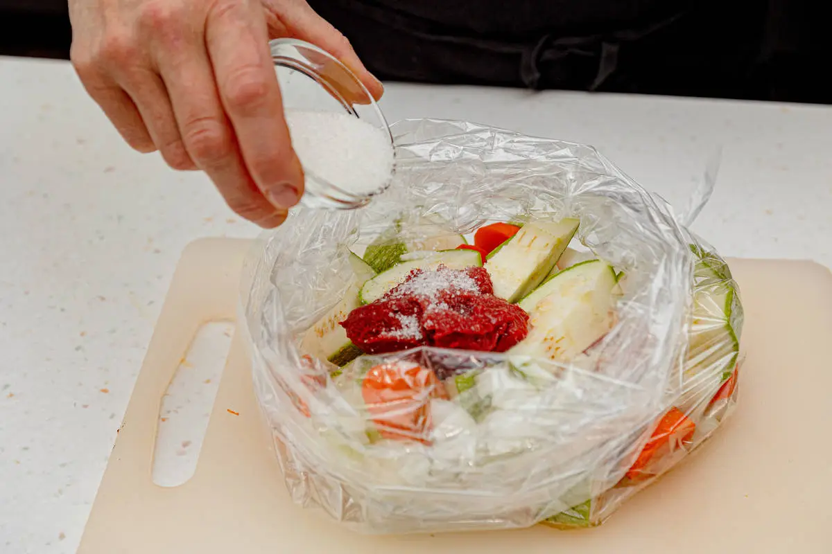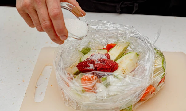 Сложите овощи в пакет для запекания, добавьте соль, сахар, томатную пасту и растительное масло.