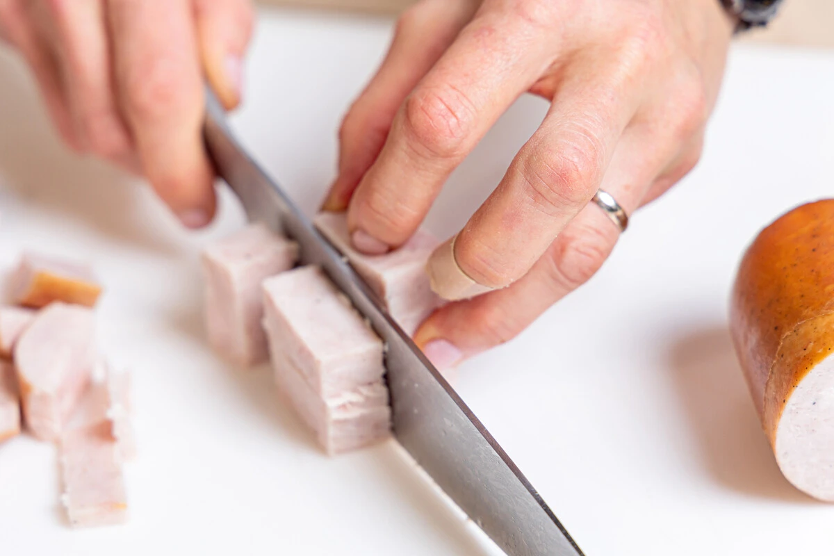 Ветчину нарежьте ломтиками толщиной примерно 1 см. Обрежьте по краям так, чтобы получились квадраты, и нарежьте крупными кусочками со сторонами примерно 2х1 см.