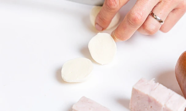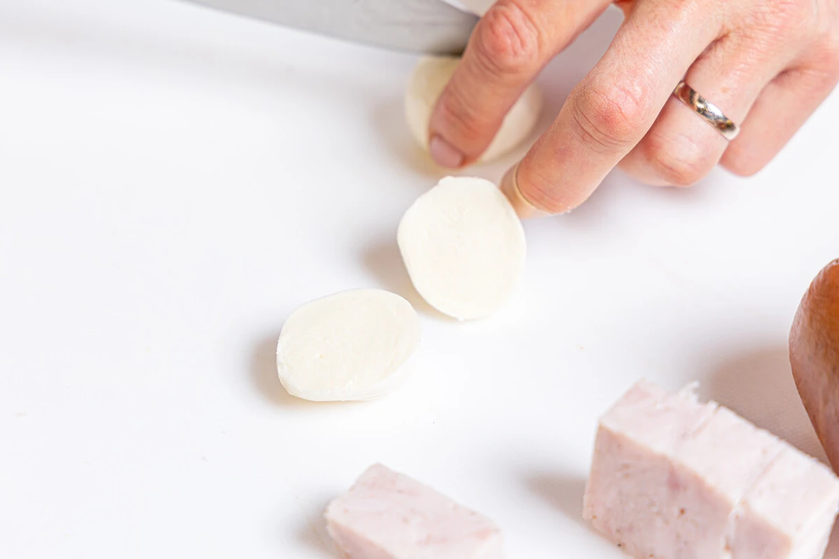 Каждый шарик моцареллы разрежьте пополам.