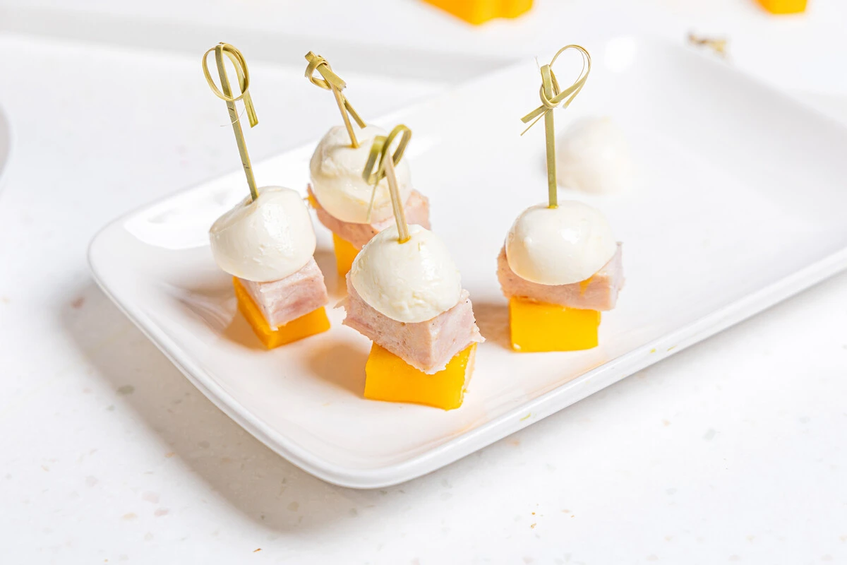 На каждую шпажку нанижите половинку шарика моцареллы, кусочек ветчины и кубик манго.
