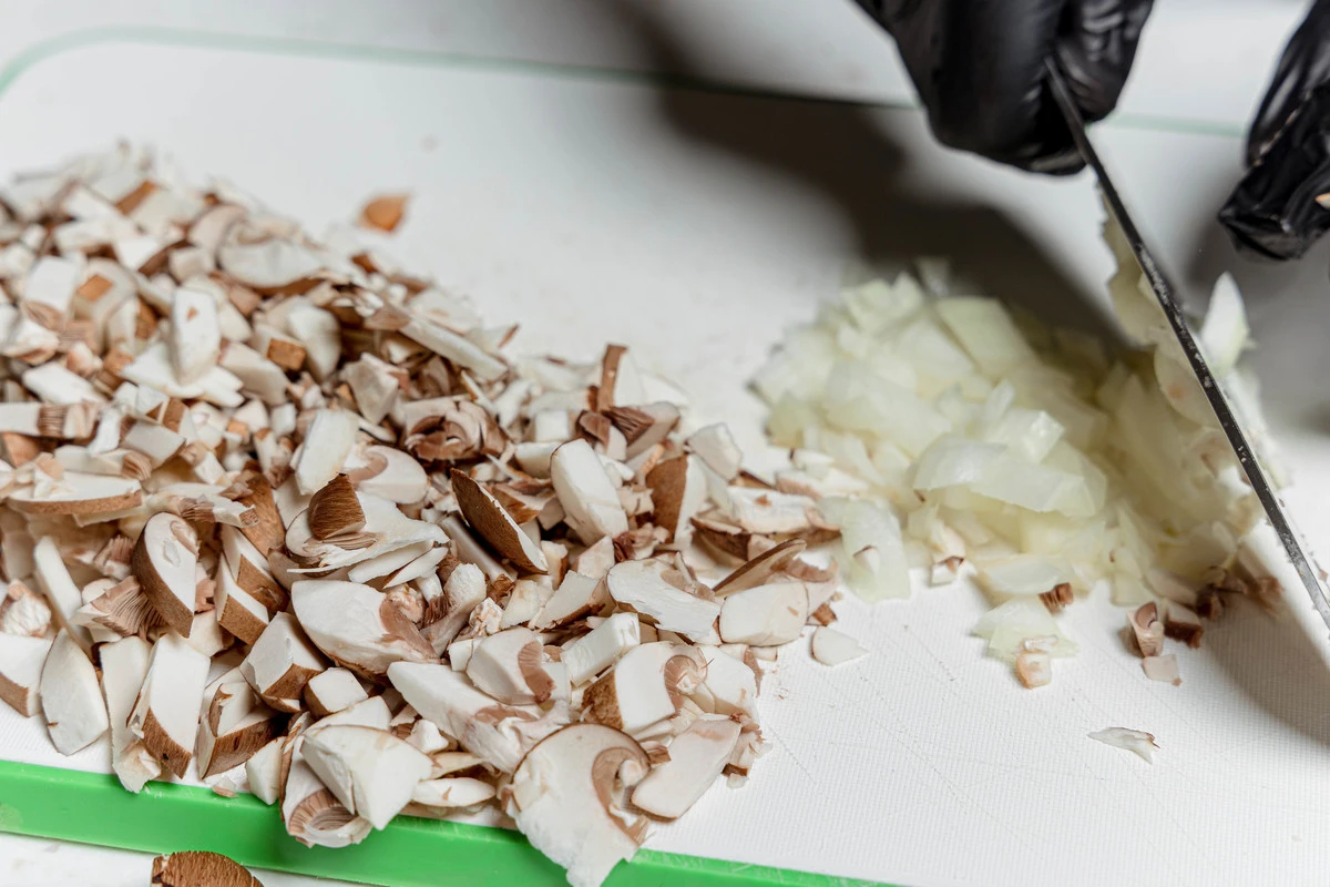 Вырезанную мякоть измельчите, добавьте к обжаренным грибам с луком и перемешайте.