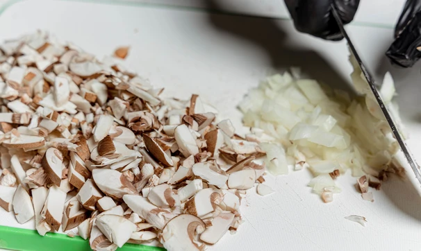 Лук очистите и нарежьте мелкими кубиками. Грибы протрите салфеткой и тоже нарежьте мелкими кубиками.