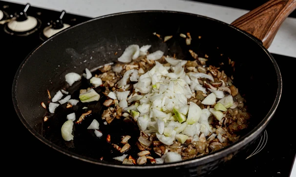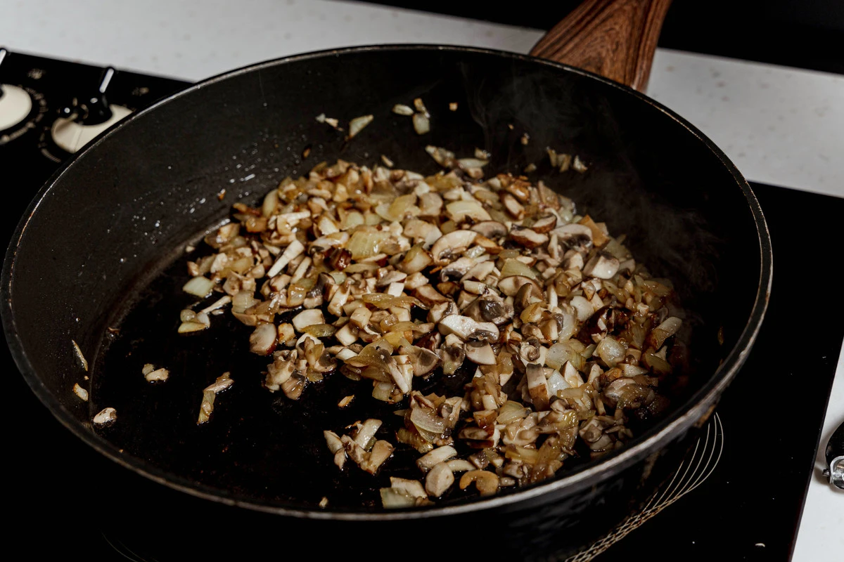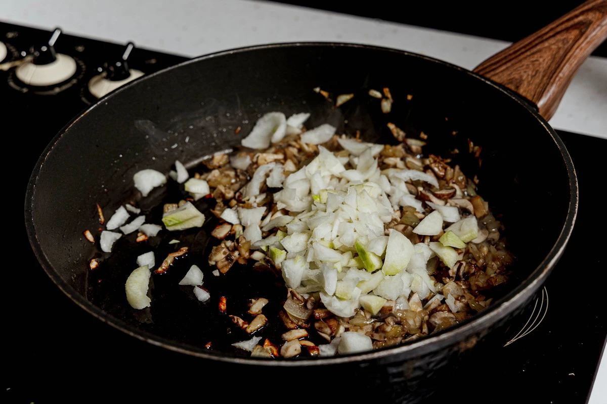 Обжарьте лук с грибами до золотистости на растительном масле, посолите по вкусу.