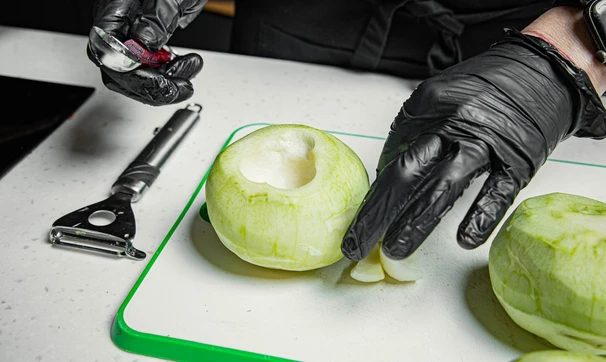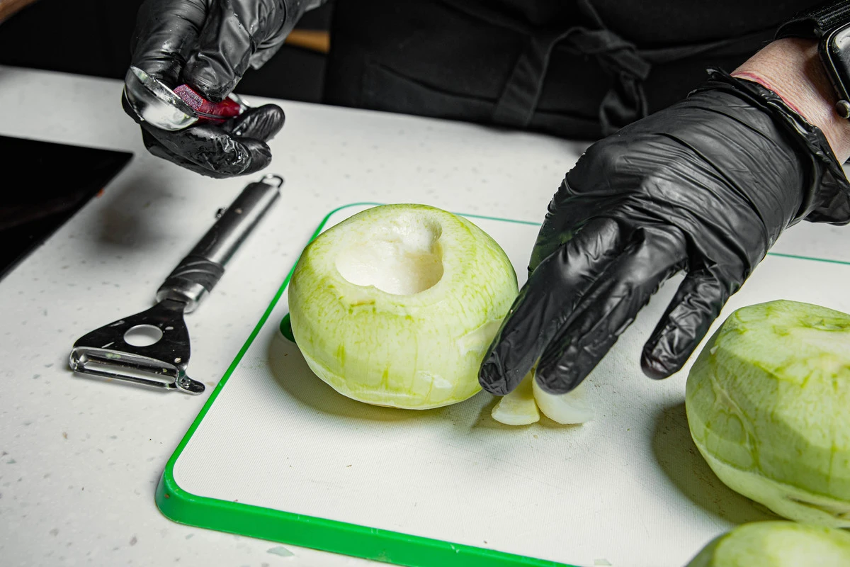 У кольраби срежьте верхнюю часть, из серединки выньте мякоть острой ложкой или ножом, чтобы получилось углубление для начинки.