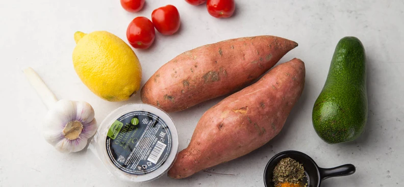Очень яркое сочетание батата и соуса из авокадо, прекрасно впишется как закуска на дружеских посиделках или в качестве лёгкого ужина.