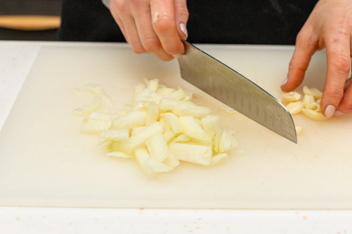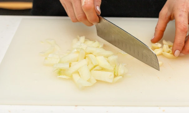 Лук очистите и нарежьте кубиками. У чеснока удалите зелёные серединки, зубчики измельчите.