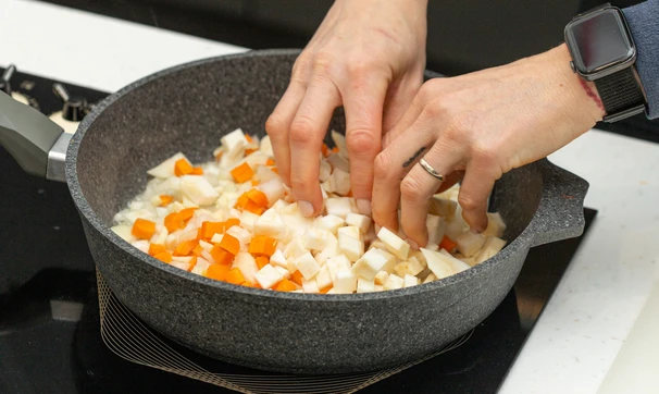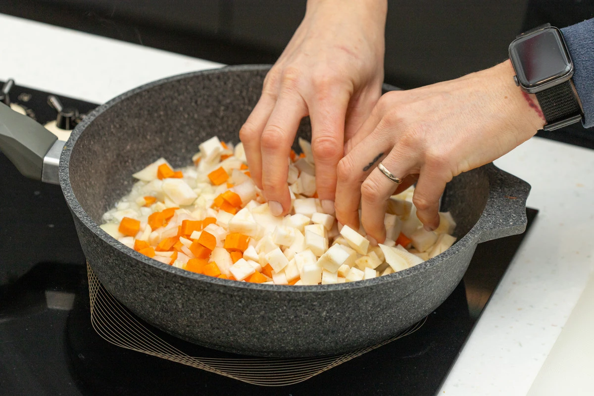 Корень сельдерея и морковь нарежьте мелкими кубиками, добавьте к луку и чесноку, всыпьте специи и обжаривайте всё вместе ещё 5 минут.