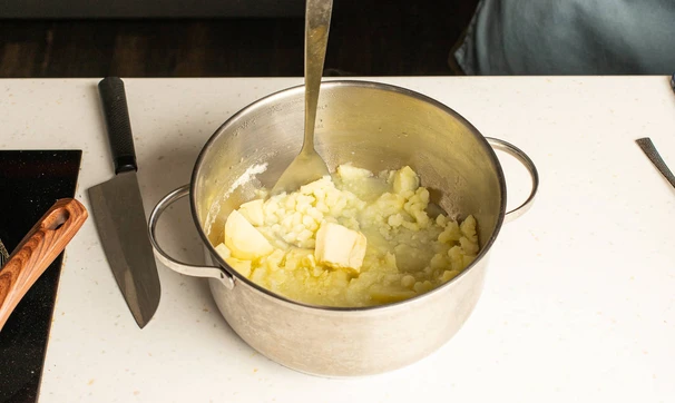 Разогрейте молоко со сливочным маслом и влейте в горячую картошку, растолките ручной толкушкой (блендер использовать не нужно). Разбейте яйцо и соль, тщательно перемешайте пюре.