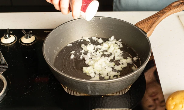 Лук почистите, нарежьте мелкими кубиками, обжарьте на растительном масле до золотистости.