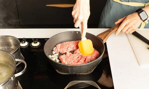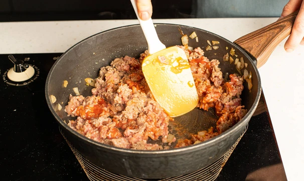 Добавьте фарш и обжаривайте, помешивая, ещё 5 минут.