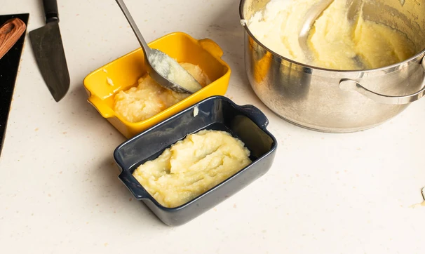 В форму для запекания положите 2-3 ст. ложки пюре и размажьте по дну.