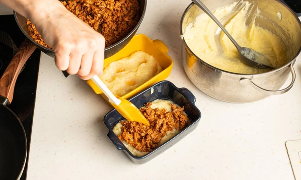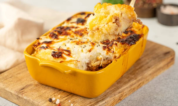 Классическая домашняя запеканка с фаршем и картофельным пюре. Обязательно добавьте щепотку корицы в фарш — вы удивитесь, насколько удачно она дополняет вкус блюда.