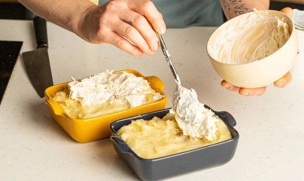Сметану перемешайте с тёртым сыром, выложите поверх пюре и разровняйте.