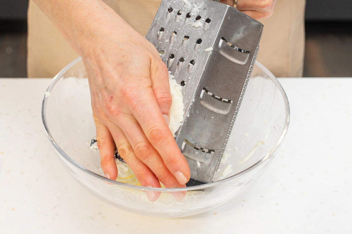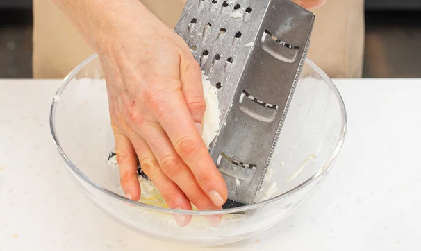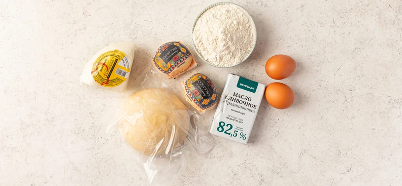 Разморозьте тесто. Натрите оба вида сыра на крупной тёрке. По желанию добавьте ⅔ банки мацони или сметаны 15–20% — так начинка получится ещё нежнее и вкуснее. Также можете добавить больше сулугуни, если любите более солёную начинку. Перемешайте.
