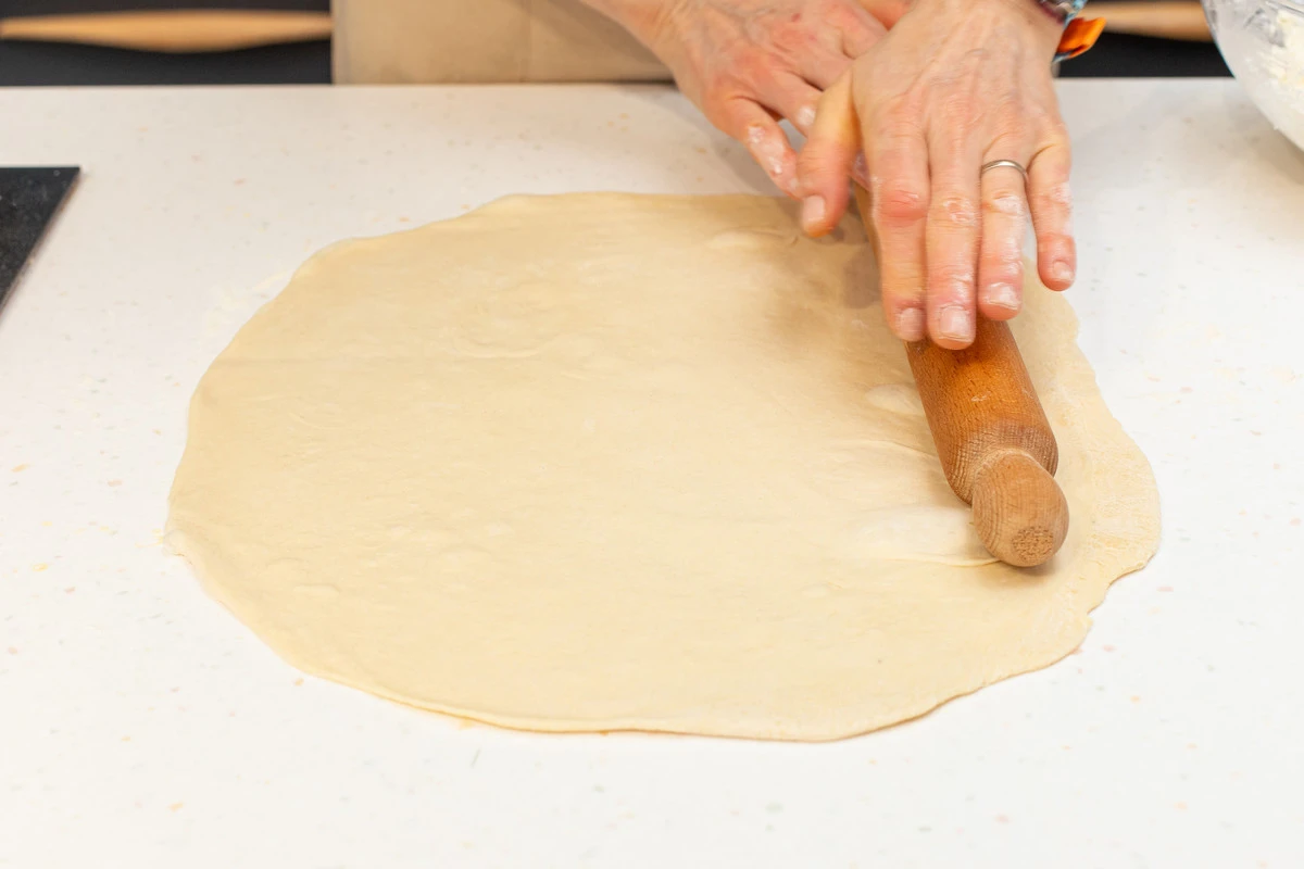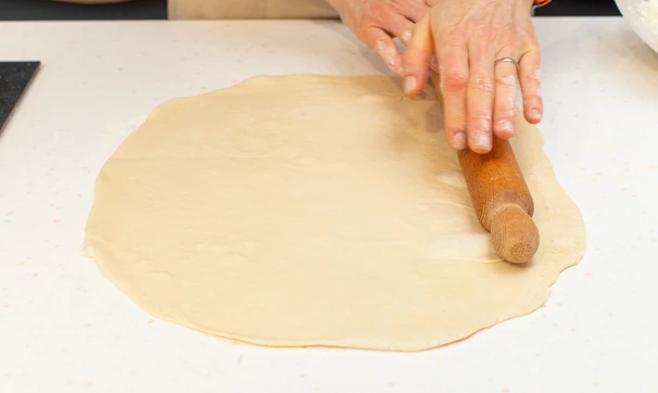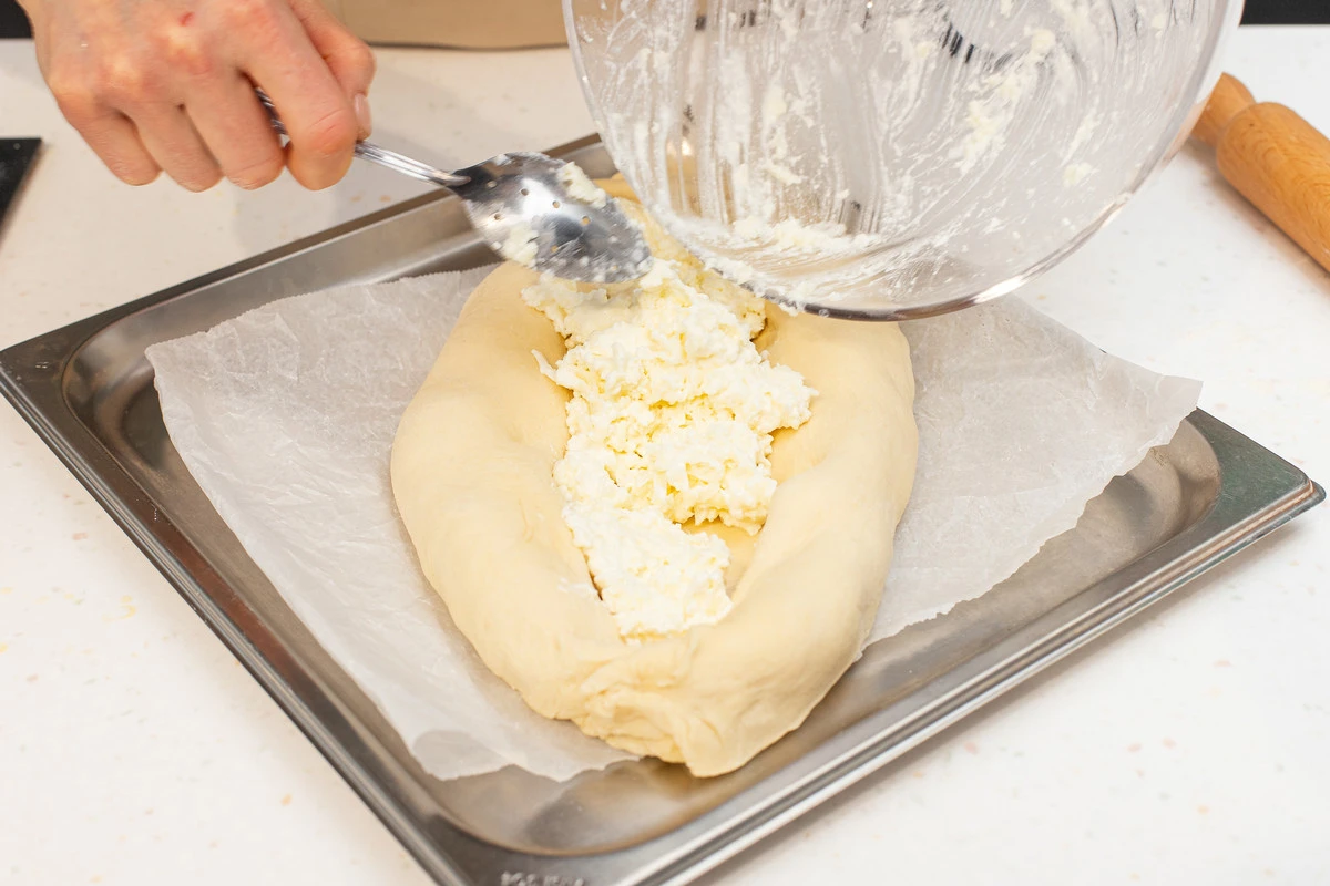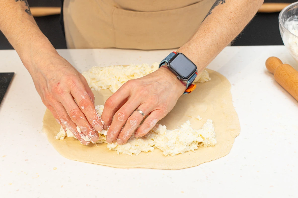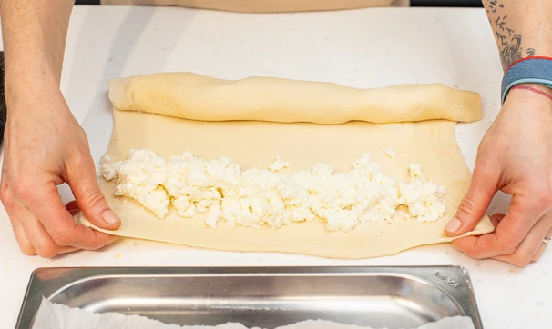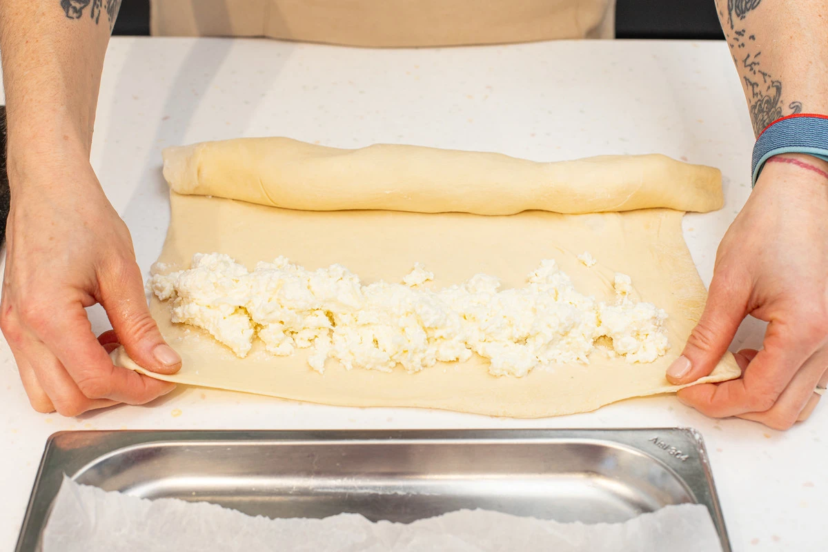 Тесто раскатайте в прямоугольный пласт толщиной примерно 4–5 мм. По краям длинных сторон пласта выложите по ⅓ начинки.